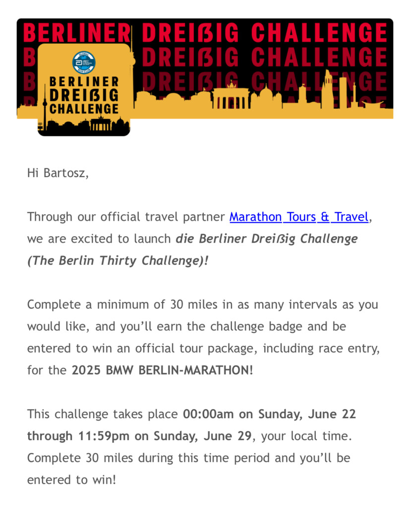 Berliner Dreißig Challenge to wirtualne wyzwanie biegowe, organizowane przez Marathon Tours & Travel. Twoim zadaniem jest pokonanie łącznie 30 mil (około 48,28 km) w dowolnych interwałach – biegając, maszerując, na bieżni lub nawet w ramach parasportu – w dniach 22–29 czerwca 2025 roku. Udział w wyzwaniu kosztuje 30 dolarów, a każdy, kto ukończy dystans, bierze udział w losowaniu wyjątkowych nagród.