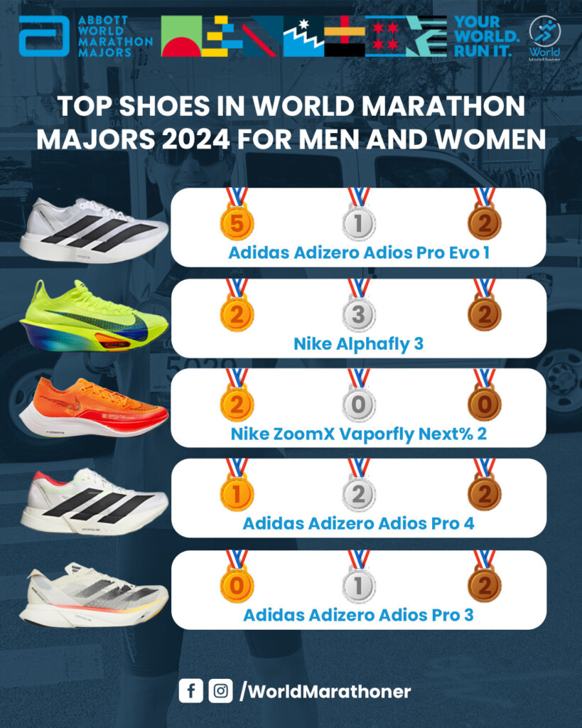 W pierwszej części sezonu dużą popularnością cieszyły się Adidas Adizero Adios Pro 3, w których zawodnicy osiągali imponujące wyniki na trasach największych maratonów świata. Jednak sytuacja zmieniła się wraz z premierą nowego modelu – Adidas Adizero Adios Pro 4. Ten zaawansowany technologicznie model szybko zdobył uznanie wśród biegaczy elity, którzy zaczęli regularnie zdobywać miejsca na podium właśnie w tych butach. Dzięki jeszcze lepszej amortyzacji i zoptymalizowanej konstrukcji podeszwy, Adidas Adizero Adios Pro 4 stały się jednym z najczęściej wybieranych modeli w drugiej połowie sezonu. Również Nike Alphafly 3 pozostają jednym z faworytów na trasach WMM. Buty te wyróżniają się zastosowaniem innowacyjnych technologii, takich jak poduszki Zoom Air oraz pianka ZoomX, które zapewniają niespotykaną dynamikę i efektywność energetyczną. Dzięki temu biegacze mogą osiągać lepsze rezultaty przy mniejszym zmęczeniu mięśni.